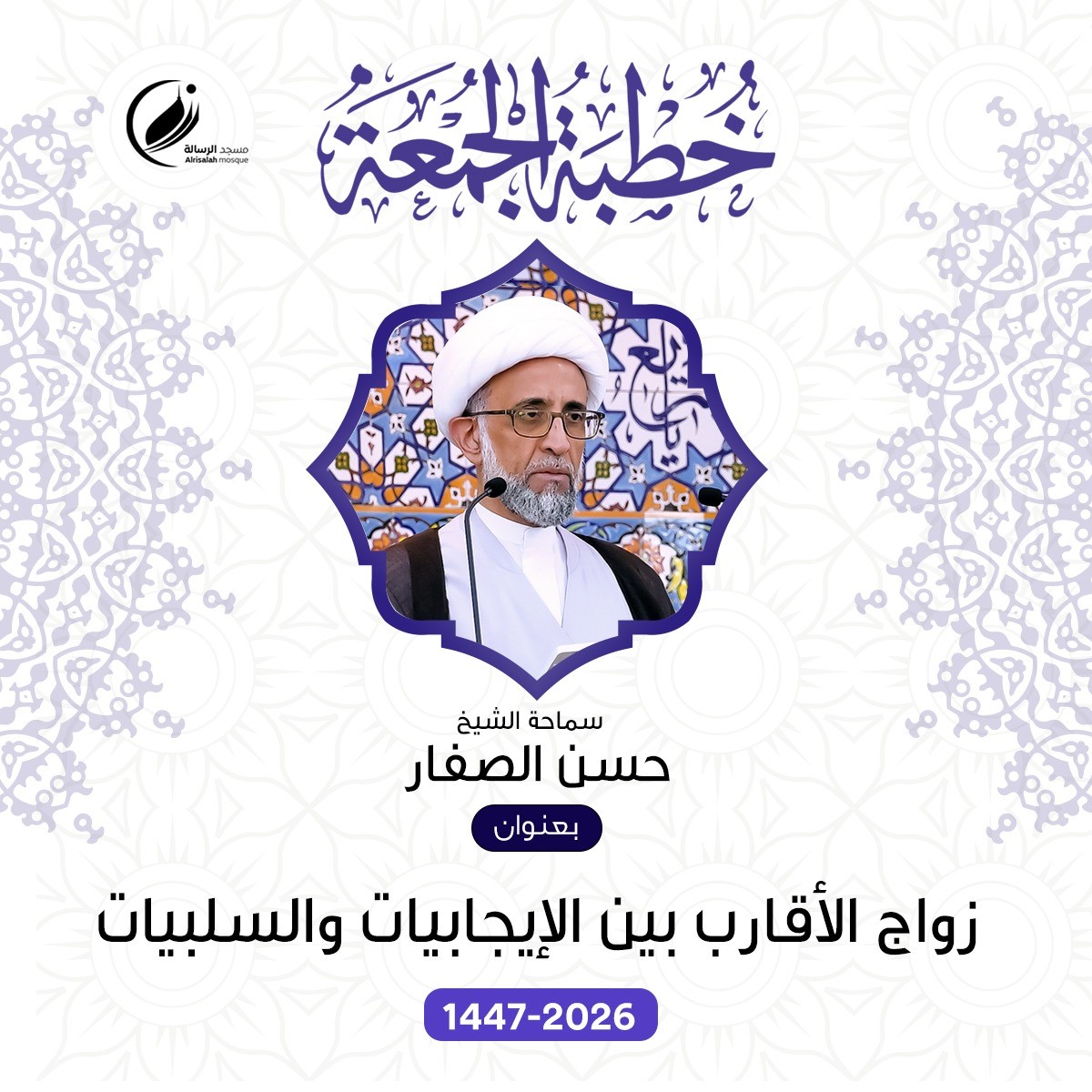 جاء ذلك ضمن خطبة الجمعة ٧ ذو القعدة 1447هـ الموافق ٢٤ أبريل 2026م، في مسجد الرسالة بالقطيف شرقي السعودية بعنوان: زواج الأقارب بين الإيجابيات والسلبيات.
