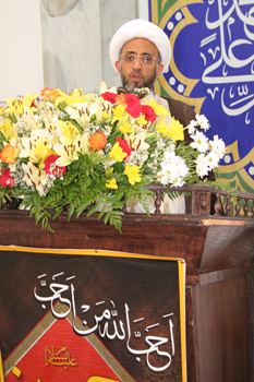 والتي احتضنت أربعة آلاف طالب, مشيراً إلى شمولية معارف الأئمة لمختلف علوم الدين والحياة, ولاتساع إطار مدرستهم لكل أبناء الأمة, فلم تكن دروس الباقرين الصادقين خاصة بأبناء مذهب, وما كان عطاؤه الأئمة محصوراً في إطار طائفة, بل كانوا في موقع البذل والعطاء لجميع أبناء الأمة, مطالباً اتباع أهل البيت بترسم طريقهم, في إنتاج خطاب يعالج هموم الأمة, وليس هموم الطائفة فقط, ويهتم بأصالة وجوهر مفاهيم الإسلام, وليس في حدود الخصوصيات المذهبية فقط. مؤكداً ان مدرسة أهل البيت في حقيقتها تمثل الفهم النقي الأصيل لرسالة الإسلام.