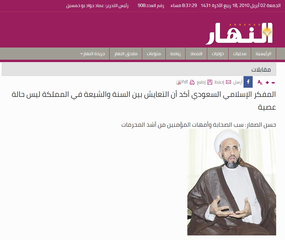 وقال الصفار في حديث مع صحيفة «عكاظ » السعودية أمس انه «حتى لو كنا نختلف في تقويم الأشخاص السابقين من الصحابة والأئمة والتابعين والعلماء، ونختلف في تحليل أحداث ووقائع التاريخ، لكن ذلك لا يجيز لأي أحد منا ان يسيء الى من يحترمه الآخر، مضيفا ان الأمر المهم هو التأكيد على العدل والمساواة بين المواطنين، ورفض أي تمييز أو ظلم أو انتقاص لحقوق المواطنة بمبرر اختلاف الانتماء المذهبي، فالوطن للجميع كما أعلن خادم الحرمين الشريفين، وكما نص عليه النظام الأساسي للحكم... وفي ما يلي نص الحوار: