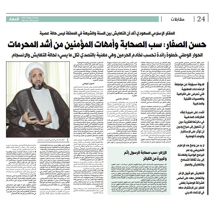 اعتبر المفكر الاسلامي الشيعي الشيخ حسن الصفار سب الصحابة الكرام وأمهات المؤمنين من أشد المحرمات، ودعا الى ميثاق شرف يؤكد على الاعتراف بتعددية المذاهب ضمن إطار الاسلام الذي يتشرف الجميع بالانتماء اليه، ويتبنى هذا تعزيز الاحترام المتبادل، ورفض أية اساءة لأي رمز أو شخصية يقدسها ويحترمها الطرف الآخر.الحوار الوطني خطوة رائدة تحسب لخادم الحرمين وهي معنية بالتصدي لكل ما يسئ لحالة التعايش والانسجام