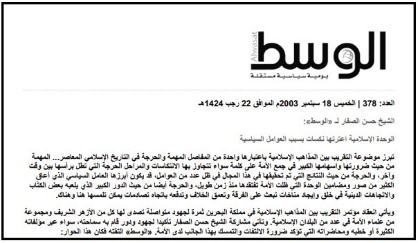 ويأتي انعقاد مؤتمر التقريب بين المذاهب الإسلامية في مملكة البحرين ثمرة لجهود متواصلة تصدى لها كل من الأزهر الشريف ومجموعة من علماء الأمة في عدد من البلدان الإسلامية. وتأتي مشاركة الشيخ حسن الصفار تأكيدا لجهود ودور قام به سماحته، سواء عبر مؤلفاته الكثيرة أو خطبه ومحاضراته التي تؤكد ضرورة الالتفات والتمسك بهذا الجانب لدى الأمة. «الوسط» التقته فكان هذا الحوار: